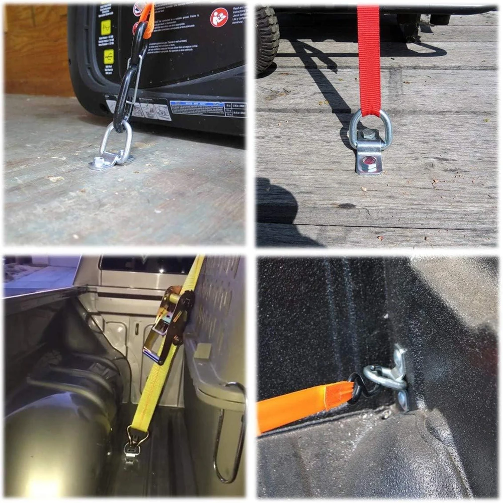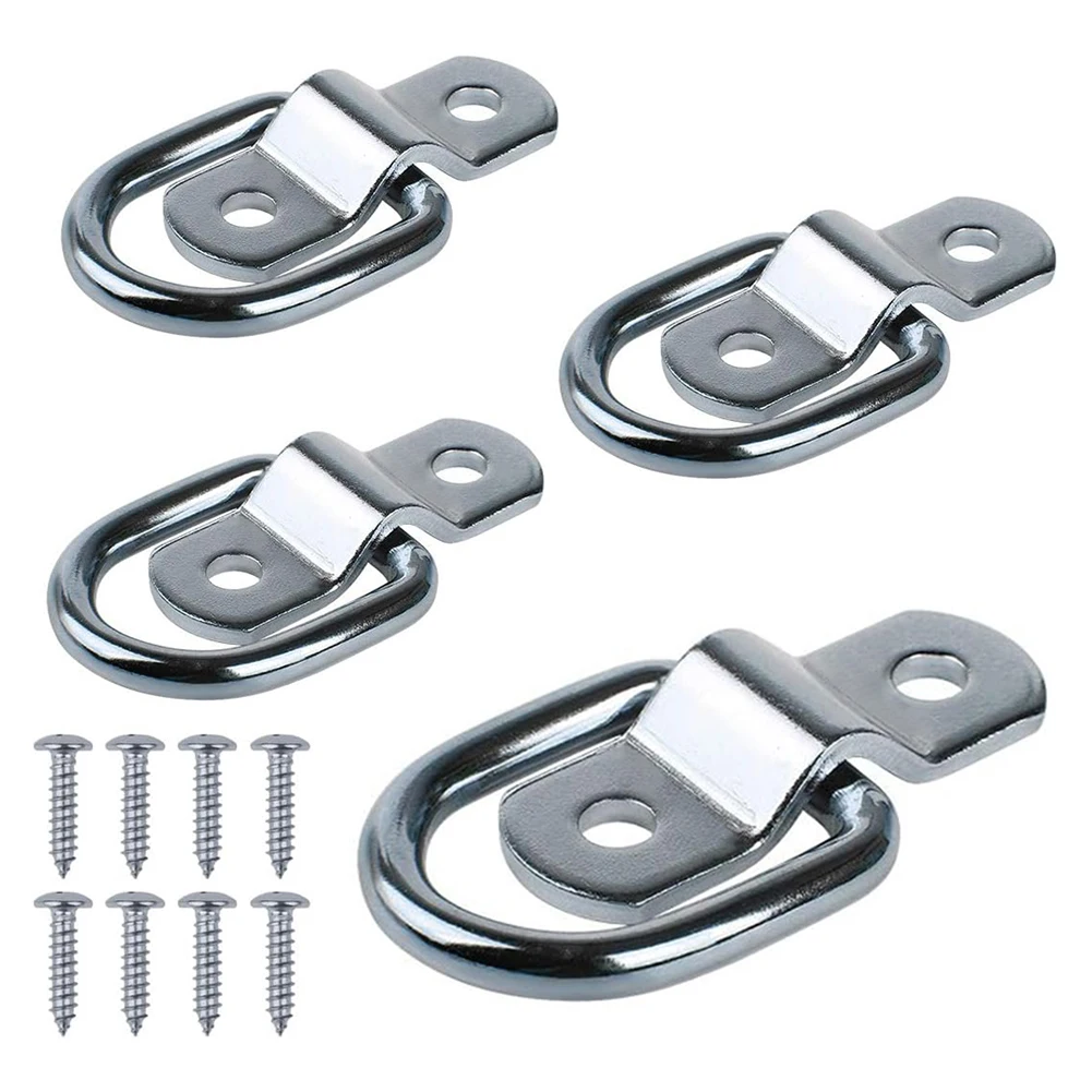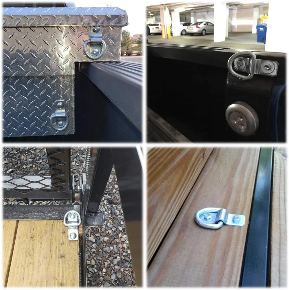 Feature: 1. Robust Construction: Our heavy duty D rings tie down anchors are crafted from high-strength steel, featuring high durability and a long lifespan. Capable of withstanding loads up to 2400 lbs, these anchors provide reliable security for your cargo. 2. Corrosion-Resistant Design: Made from specially heavy-duty galvanized solid steel, our trailer anchor rings are designed to resist corrosion and rust, ensuring long-term reliability and performance in all weather conditions. 3. Convenient Anchor Point for Various Ties: These truck bed anchors serve as a convenient anchor point for ropes, bungee cords, or straps, making them extremely versatile. They are widely used in trucks, kayaks, ATVs, RVs, vans, boats, and trailers, providing a secure tie-down solution for a variety of applications. 4. Easy Installation: Each tie down ring is straightforward to install, allowing you to quickly create secure tie-down points wherever needed. This ease of installation makes them perfect for fast-paced loading and unloading scenarios. 5. Heavy-Duty Steel D-Ring: The steel D-ring tie down anchor is designed for superior strength and security, ensuring that your cargo stays in place during transport. Whether you're on the road or at sea, you can trust these D-rings to keep your belongings safe and secure.