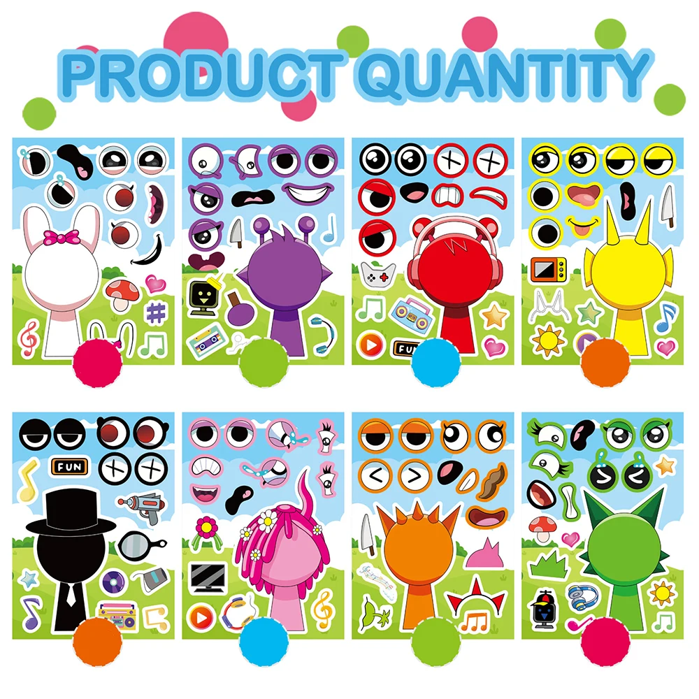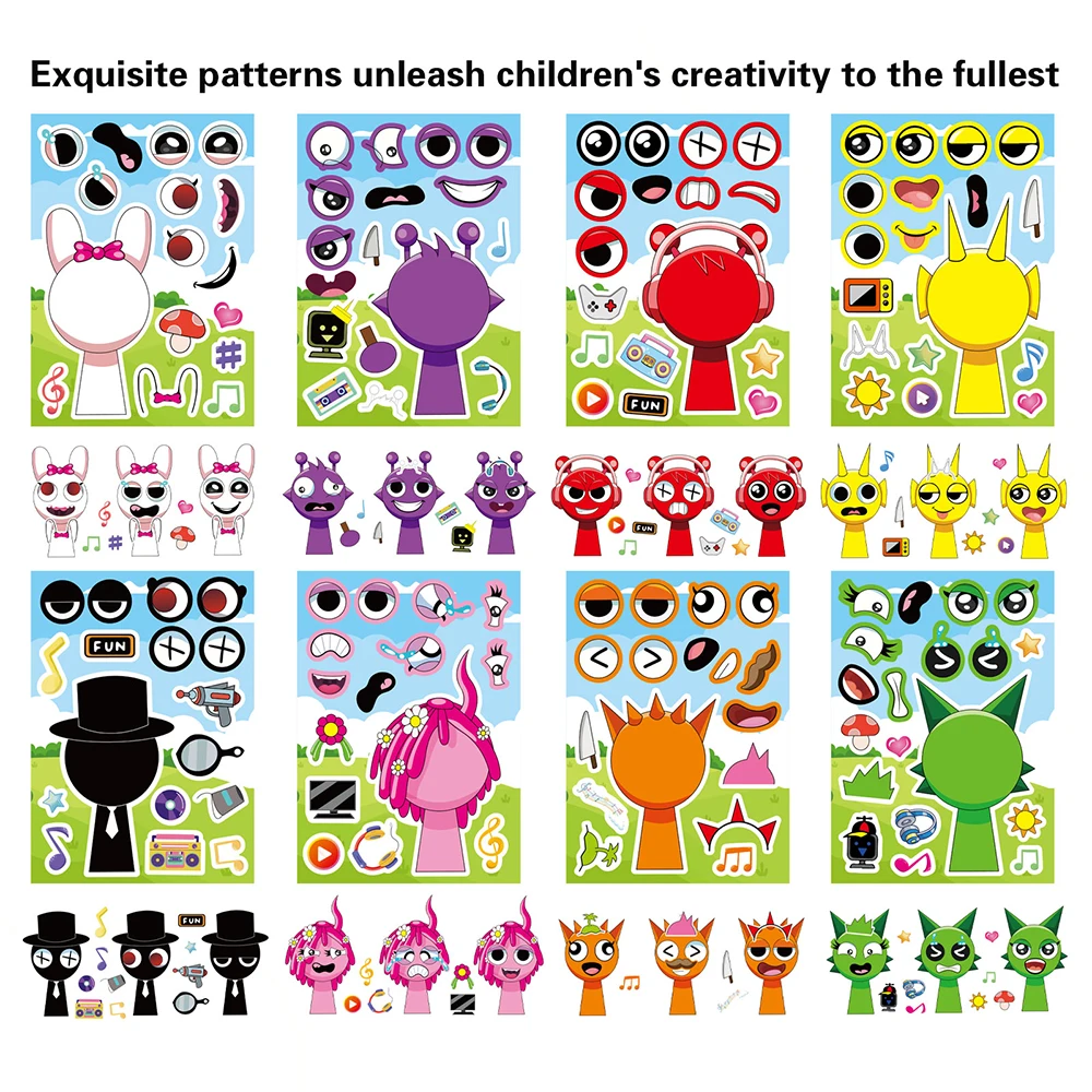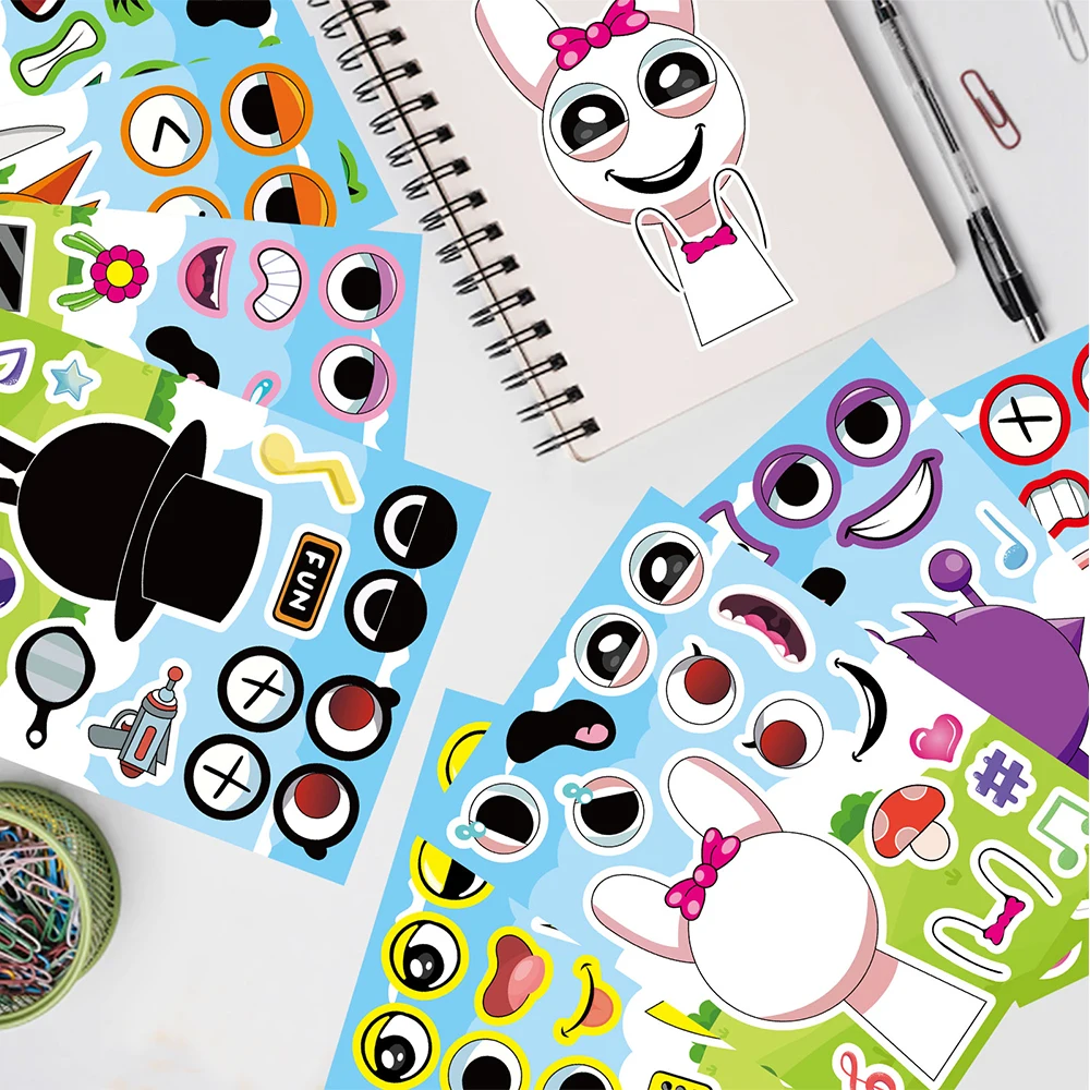 8/16Sheets Incredibox Sprunki Funny Puzzle Sticker Make a Face Decals Game Kids Toys Cartoon Assemble Jigsaw Children Party Gift