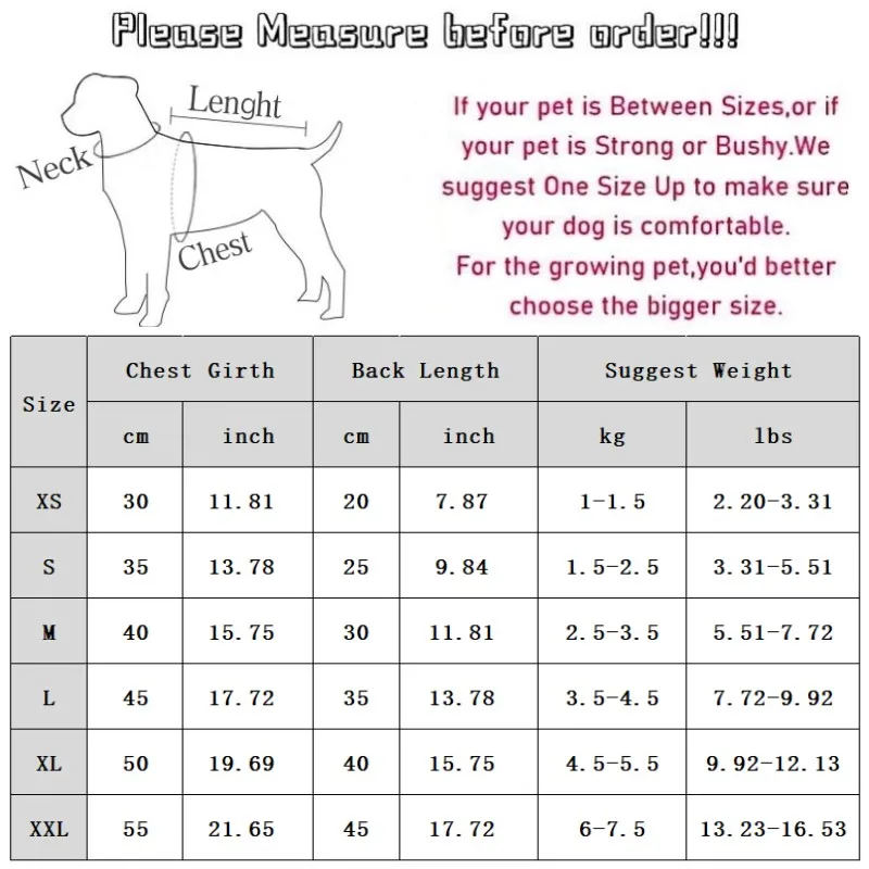 XXL Chest 55cm/21.65'' ;Length 45cm/17.72''; Suggest Weight 6-7.5kg/13.23-16.53 lbs